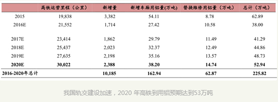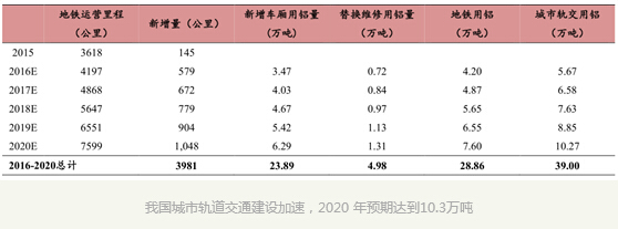 地鐵:地鐵占城市軌道交通比例 74% ,預期未來五年新建鋁城市軌道交通用鋁 23.9 萬噸,車體大部件折舊替換約用鋁約 5 萬噸 。 根據以上粗略估計,預期未來五年城市軌道交通用鋁需求到將達到39 萬噸,2020年將達到 10.3 萬噸。